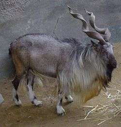 The markhor /ˈmɑːkɔː/ (Capra falconeri; Pashto: مرغومی marǧūmi; Persian/Urdu: مارخور) is a large species of wild goat that is found in northeastern Afghanistan, northern and central Pakistan, Kashmir State in northern India, southern Tajikistan, southern Uzbekistan and in the Himalayas.[2]