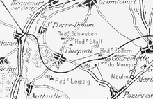 An attack from Schwaben Redoubt was met by machine-gun fire but a party of about fifty men reached a trench near Stuff Redoubt, finding it empty and about 200 men reached an artillery position in a fold known as Artilleriemulde (Boom Ravine), in front of the Grandcourt Line and more troops arrived 300 yd (270 m) to the north.[17] By 10:00 a.m. the breakthrough on the 26th Reserve Division front had made Thiepval vulnerable to an attack from the redoubt, which would make the village untenable. Soden ordered Auwäter to recapture the redoubt and sent a battalion of Bavarian Reserve Infantry Regiment 8 (BRIR 8) as a reinforcement. Auwäter ordered the counter-attack to begin immediately by three groups, from the north-east, east and south-east, to forestall an Irish wheeling movement against Thiepval and Ovillers. II Battalion, BRIR 8 (Major Roesch) comprising Group 3 was to attack from Stuff Redoubt but delays caused to message runners and the British bombardment delayed the advance from Irles.[18]