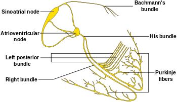 The sinoatrial node is found in the upper part of the right atrium near to the junction with the superior vena cava.[37] The electrical signal generated by the sinoatrial node travels through the right atrium in a radial way that is not completely understood. It travels to the left atrium via Bachmann's bundle, such that the muscles of the left and right atria contract together.[38][39][40] The signal then travels to the atrioventricular node. This is found at the bottom of the right atrium in the atrioventricular septum—the boundary between the right atrium and the left ventricle. The septum is part of the cardiac skeleton, tissue within the heart that the electrical signal cannot pass through, which forces the signal to pass through the atrioventricular node only.[7] The signal then travels along the bundle of His to left and right bundle branches through to the ventricles of the heart. In the ventricles the signal is carried by specialized tissue called the Purkinje fibers which then transmit the electric charge to the heart muscle.[41]
