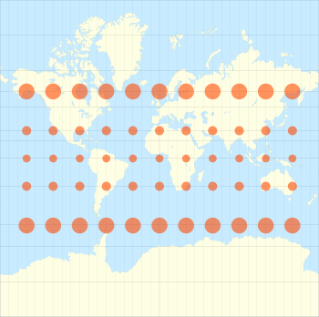 In the mathematical addendum it is shown that the point scale in an arbitrary direction is also equal to so the scale is isotropic (same in all directions), its magnitude increasing with latitude as . In the Tissot diagram each infinitesimal circular element preserves its shape but is enlarged more and more as the latitude increases.