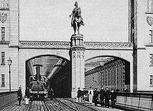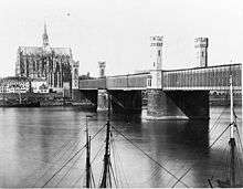 The Cathedral Bridge (German: Dombrücke pronounced [ˈdoːmˌbʁʏkʰə]) was a railway and street bridge crossing the river Rhine in the German city of Cologne. It was owned by the Cologne-Minden Railway Company and named after the Cologne Cathedral, which is located on the same longitudinal axis. It was built in combination with the original Central Station (German: Zentralbahnhof pronounced [tsɛnˈtʰʁaːlˌbaːnɦoːf]) and a new ground-level railway track through the north Altstadt of the Cologne Innenstadt. As the Cathedral Bridge could not bolster the increased traffic of the new Köln Hauptbahnhof in 1894, it was replaced by the Hohenzollern Bridge in 1911.