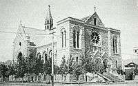 The first Catholic church in Boise was dedicated on Christmas Eve 1870, but was destroyed in a fire 18 days later.[2] Another frame structure was built that would serve as the cathedral of the Vicariate Apostolic of Idaho, established March 5, 1883, and the Diocese of Boise after it was established on August 25, 1893.[3] It was located on the northwest corner of Ninth and Bannock Streets.[4] As the city grew, a larger cathedral was needed and Bishop Alphonse Glorieux purchased property bounded by Fort, Hays, Eighth, and Ninth Streets. He laid the cornerstone for the present cathedral in 1906. So as not to be a financial drain on the parish, the church building was built in stages. After the lower level was completed the parish worshiped there. The walls and roof were completed in 1912, and the cathedral was completed in 1921 during the episcopate of Bishop Daniel Gorman, who dedicated it on March 27, Easter Sunday.
