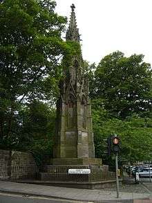 A monument, in the style of an Eleanor cross and designed by David Bryce,[7] was erected to her memory on the SE corner of St Colme Street in Edinburgh's New Town (just north of Charlotte Square). The inscription is,