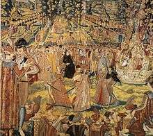 Catherine had ordered that at the Château de Fontainebleau, each important noble should host a ball. She herself held a banquet in a meadow at the château's dairy, where her courtiers dressed as shepherds and shepherdesses.[13] That evening, the court watched a comedy in the great ballroom, which was followed by a ball where 300 "beauties dressed in gold and silver cloth" performed a choreographed dance.[14]