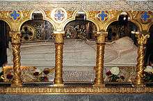 Her head however, was parted from her body and inserted in a gilt bust of bronze. This bust was later taken to Siena, and carried through that city in a procession to the Dominican church. Behind the bust walked Lapa, Catherine's mother, who lived until she was 89 years old. By then she had seen the end of the wealth and the happiness of her family, and followed most of her children and several of her grandchildren to the grave. She helped Raymond of Capua write his biography of her daughter, and said, "I think God has laid my soul athwart in my body, so that it can't get out."[32] The incorruptible head and thumb were entombed in the Basilica of San Domenico at Siena, where they remain.[31]