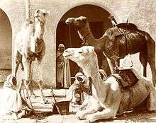 - 1 2 3 Méhara was originally an Arabic masculine singular noun[28] used in North Africa to refer to dromedary camels. As it acquired its modern sense the singular form became méhari,[29] with the plural form eventually becoming méhara[28] or, optionally, méharis.[29] The modern word refers to a camel which is ridden by a méhariste, a person who rides a méhari or méhara for the purpose of travel through the desert. Méhara dromedaries are taller and slimmer than dromedaries used as pack animals. They are supremely noble animals, svelte, proud in appearance, and with a coat of white fur. They are animals for riding, suitable for razzias (military raids) and racing, and originate from Algeria.