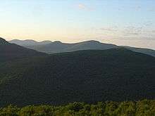 The Catskill Escarpment, often referred to locally as just the Escarpment or the Great Wall of Manitou,[1] and known as the Catskill Front to geologists, is the range forming the northeastern corner of the Catskill Mountains in Greene and Ulster counties in the U.S. state of New York. It rises very abruptly from the Hudson Valley to summits above 3,000 feet (910 m) in elevation, including three of the Catskill High Peaks, with almost no foothills. The plateau to the south and west averages 2,000 feet (610 m) above sea level.