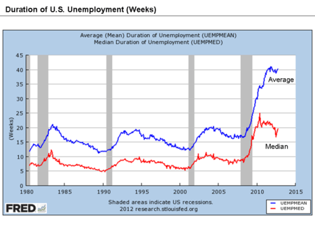 The ratio of long-term unemployed (27 weeks or longer) to unemployed rose from 17.3% in December 2007 (pre-recession) to a peak of 48.1% during April 2010. It has steadily fallen to a still elevated 30.4% as of June 2014.[40][41] This is well above the 1980-2007 average of approximately 16% and the approximately 20-25% level typical in previous recessions since 1980.[42][43]