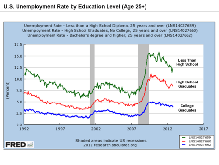 Workers with higher levels of education face considerably lower rates of unemployment. As of September 2012, for workers of age 25 or older, unemployment was approximately: 12% for those with less than a high school diploma; 9% for high school graduates; 6% for those with some college or an associate degree; and 4% for those with a bachelor's degree or higher.[30]