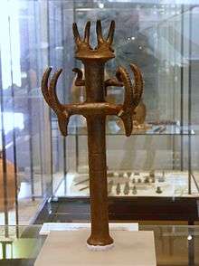 In 1961, Israeli archaeologist Pessah Bar-Adon discovered a hoard of Chalcolithic artifacts in a cave on the northern side of Nahal Mishmar.[1] The hoard included 432 copper, bronze, ivory and stone decorated objects; 240 mace heads, about 100 scepters, 5 crowns, powder horns, tools and weapons.[2][3] Archaeologist David Ussishkin has suggested the hoard was the cultic furniture of the abandoned Chalcolithic Temple of Ein Gedi.[4][5] Prominent finds from the hoard are currently on display in the archaeology wing of the Israel Museum in Jerusalem.