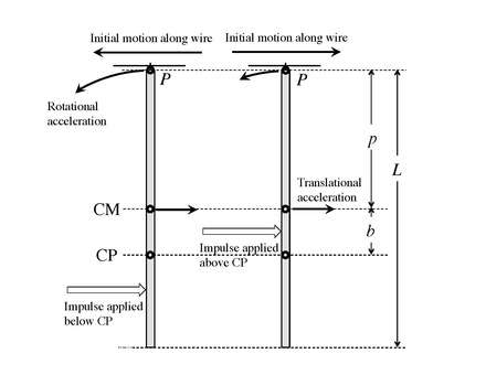 Imagine a rigid beam suspended from a wire by a fixture that can slide freely along the wire at point P, as shown in the Figure. An impulsive blow is applied from the left. If it is below the center of mass (CM) it will cause the beam to rotate counterclockwise around the CM and also cause the CM to move to the right. The center of percussion (CP) is below the CM. If the blow falls above the CP, the rightward translational motion will be bigger than the leftward rotational motion at P, causing the net initial motion of the fixture to be rightward. If the blow falls below the CP the opposite will occur, rotational motion at P will be larger than translational motion and the fixture will move initially leftward. Only if the blow falls exactly on the CP will the two components of motion cancel out to produce zero net initial movement at point P.