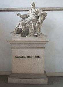Cesare Bonesana-Beccaria, Marquis of Gualdrasco and Villareggio[1] (Italian: [ˈtʃeːzare bekkaˈriːa]; 15 March 1738  28 November 1794) was an Italian criminologist,[2] jurist, philosopher, and politician, who is widely considered as the most talented jurist[3] and one of the greatest thinkers of the Age of Enlightenment. Recognised to be one of the fathers of classical criminal theory and modern penology,[4] he is well remembered for his treatise On Crimes and Punishments (1764), which condemned torture and the death penalty, and was a founding work in the field of penology and the Classical School of criminology by promoting criminal justice.