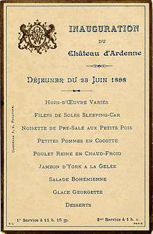 Ardenne Castle, or the Royal Castle of Ardenne (Château Royal d'Ardenne, formerly also spelled "Hardenne") was situated in the municipality of Houyet in Belgium not far from Ciergnon Castle. The construction of the building was ordered in 1874 by King Leopold II of Belgium, to the plans of his architect Alphonse Balat. It replaced an older hunting lodge built in the 1830s by Leopold I.