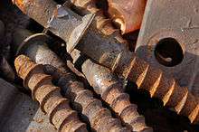 A screw spike, rail screw or lag bolt is a large (~6 in or 152 mm length, slightly under 1 in or 25 mm diameter) metal screw used to fix a tie plate or to directly fasten a rail. Screw spikes are screwed into a hole bored in the sleeper.[15] The screw spike has a higher cost to manufacture than the rail spike, but has the advantage of greater fixing power - approximately twice that of a rail spike[16] - -and can be used in combination with spring washers.[15]