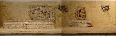 The left scene is a well-known Hellenistic scene often found in Gandhara. On the left is represented a young couple, the woman holding a drinking cup in the right hand, and with her left hand opening the man's chlamys (a Greek cloak) to show his naked body. On the right is an elderly couple in Greek dress, the man bearded, with a small child clinging to the man. It is thought that this scene may symbolize the cycle of life, from childhood, to adulthood and maturity.