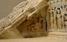 The second tier is sided by triangular stair risers, which depict a Hellenistic winged Ketos sea monster, a motif often seen with such a function in Greco-Buddhist art. It is thought that the Ketos symbolizes the transition to the other world after death. Some of the Buner reliefs are much better preserved and give a better picture of the original Ketos design.