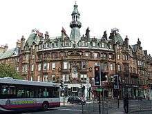 Charing Cross is a major road junction in the Scottish city of Glasgow. It is situated north of the River Clyde at the intersection of Sauchiehall Street, St George's Road, Woodlands Road, North Street and Newton Street, as well as being at a major interchange of the M8 motorway. Formerly the gateway from the shopping area of Sauchiehall Street to the more prosperous Woodlands area, its architectural qualities were largely razed by the building of the motorway. It still marks the boundary between the City Centre and the West End of the City. Nearby landmarks include the Mitchell Library, the biggest reference library in Western Europe.