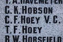 Charles Ferguson Hoey, VC as inscribed on the cenotaph in the Charles F. Hoey VC Memorial Park in downtown Duncan, BC