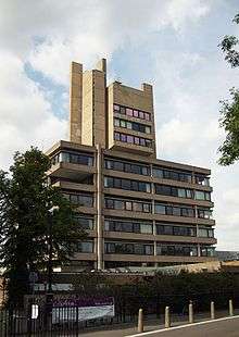 The Charles Wilson Building at the University of Leicester was designed by Sir Denys Lasdun in the brutalist style, and completed in 1963.[4] It is Category B listed.[4] It is the University's main social and catering building, and is licensed as a venue for civil weddings and civil partnerships.[5]