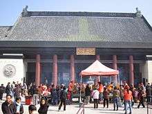 The current Che Kung temple, in Japanese-style,[8] was built in 1993–1994 at a cost of HK$48 million.[4] It is eight times the size of the old one.[6] The main hall contains a giant statue of Che Kung. Next to it is a fan-bladed wheel of fortune, which, worshippers believe, will bring good luck when turned three times. Fortune-tellers can be found within the temple.[5]