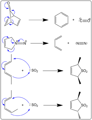 Specifically, cheletropic reactions are a subclass of cycloadditions. The key distinguishing feature of cheletropic reactions is that on one of the reagents, both new bonds are being made to the same atom.[3] A few examples are shown to the right. In the first case, the single atom is the carbonyl carbon that ends up in carbon monoxide. The end result is making two new bonds to one atom. The first two examples are known as cheletropic extrusions because a small stable molecule is given off in the reaction. The driving force for these reactions is often the entropic benefit of gaseous evolution (e.g. CO or N2).[2]