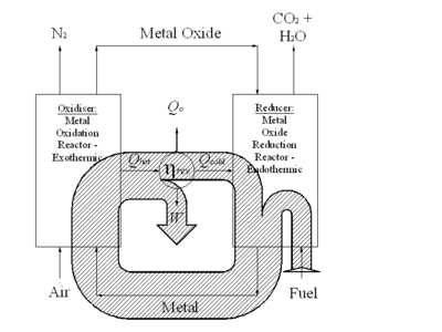 2 from fossil fuels, using two interconnected fluidized beds.[1] Later it was proposed as a system for increasing power station efficiency.[2] The gain in efficiency is possible due to the enhanced reversibility of the two redox reactions; in traditional single stage combustion, the release of a fuel’s energy occurs in a highly irreversible manner - departing considerably from equilibrium. In CLC, if an appropriate oxygen carrier is chosen, both redox reactions can be made to occur almost reversibly and at relatively low temperatures. Theoretically, this allows a power station using CLC to approach the ideal work output for an internal combustion engine without exposing components to excessive working temperatures.