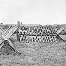 The cheval de frise (plural: chevaux de frise [ʃə.vo də fʁiz], "Frisian horses") was a medieval defensive anti-cavalry measure consisting of a portable frame (sometimes just a simple log) covered with many projecting long iron or wooden spikes or spears.[1] They were principally intended as an anti-cavalry obstacle but could also be moved quickly to help block a breach in another barrier. They remained in occasional use until they were replaced by wire obstacles just after the American Civil War. During the Civil War, the Confederates used this type of barrier more often than the Union forces.[2] During World War I, armies used chevaux de frise to temporarily plug gaps in barbed wire.[3] Chevaux de frise of barbed wire were used in jungle fighting on south Pacific islands during World War II.