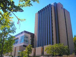 Between 1910 and 1971, the site of Chevron Science Center had been occupied by the former State Hall, the first building erected upon Pitt's move in the early 20th century to the Oakland campus and at various times home to the university's library, administration, and engineering department.[2] Chevron Science Center's $14.7 million cost ($78.5 million today) was partially offset by a $2 million grant ($11.3 million today) from the National Science Foundation. Its completion brought together under one roof many chemistry facilities that were, at the time, scattered among eight different buildings on Pitt's campus.[3] Upon its completion, it was the largest school building for chemistry instruction and research east of the Mississippi River.[4] The building also received a second place award in the "Lab of the Year" contest conducted by Industrial Research magazine.[5] It contains a 500-seat auditorium dedicated to Lauren H. Ashe, a 1914 Pitt alumnus who was a pioneer in the pharmaceutical industry.[4]