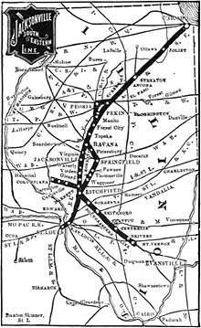 Both lines, connecting Jacksonville and Springfield to Pekin, were sold to the Wabash in 1881, but, after the Wabash defaulted, the lines were sold in mid-1888 to a new Chicago, Peoria and St. Louis Railway,[3][6] a subsidiary of the Jacksonville Southeastern Railway (reorganized in 1890 as the Jacksonville, Louisville and St. Louis Railway). The latter company, with a main line from Jacksonville southeast to Centralia via Litchfield, soon assembled a system - the "Jacksonville Southeastern Line" - by leasing the St. Louis and Chicago Railway (Springfield to Litchfield) in September 1890, and building, as a part of the Chicago, Peoria, and St. Louis, a line from Litchfield southwest to Madison (near East St. Louis). The connection to East St. Louis was completed in November 1890, and in December the company inaugurated, in cooperation with the Atchison, Topeka and Santa Fe Railroad, a through Pullman car passenger service between Chicago and St. Louis.[2][7][8]