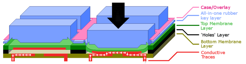 Unlike the membrane keyboard, where the user presses directly onto the top membrane layer, this form of chiclet keyboard places a set of moulded rubber keys above this. With some key designs, the user pushes the key, and under sufficient pressure the thin sides of the rubber key suddenly collapse. In other designs — such as that seen in the diagram — the deliberate weak point is where the key joins the rest of the sheet. The effect is similar in both cases. This collapse allows the solid rubber center to move downwards, forcing the top membrane layer against the bottom layer, and completing the circuit. The "sudden collapse" of the chiclet keyboard (along with the movement of the key) provides a greater tactile feedback to the user than a simple flat membrane keyboard.