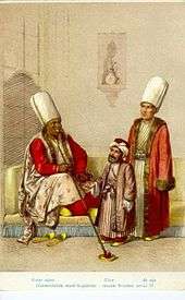 Black slaves, usually purchased as boys from Nubia, then castrated and inducted into the palace service, had begun to be employed as the guards of the women of the Sultan's harem since the time of Murad III's predecessor, Selim II (r. 1566–1574), and continued to do so until the Ottoman Empire's end.[9][16] The eunuchs usually received flower names, and after a period of training in the palace school, they entered service in the harem.[9] The eunuchs began at the post of ordinary recruit (en aşağı, literally "the lowest", and acemi ağa, "the untrained"), and gradually advanced through the ranks, from nevbet kalfa ("watch substitute") to senior posts in the guard of the harem.[7][17] Having completed their training and after a period of service, some were detached from guard duties and transferred to the attendance of the inhabitants of the harem: the Sultan's personal attendants (müsahip ağaları), the seven eunuch servants plus a head eunuch (baş ağa) attached to each valide, principal wife (kadın), or prince (şehzade), the eunuch imams who led harem prayers, the harem's treasurer (haznedar ağası), or the müsendereci, who supervised the work of the other eunuchs.[7] The senior-most eunuchs were known as hasıllı, from an Arabic word meaning "product".[17]
