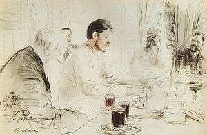 Maxim Gorky reading his drama Children of the Sun at The Penates, the house of the artist Ilya Repin, who did the drawing in 1905.