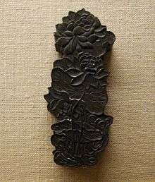 The traditional Chinese method of making the ink was to grind a mixture of hide glue, carbon black, lampblack, and bone black pigment with a pestle and mortar, then pouring it into a ceramic dish where it could dry.[2] To use the dry mixture, a wet brush would be applied until it reliquified,[2] or more commonly in East Asian calligraphy, grind against an inkstone. The manufacture of India ink was well-established by the Cao Wei dynasty (220–265 AD).[10] Historically the ink used in China were in the form of ink sticks made of lampblack and animal glue.