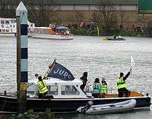 The Chiswick reach of the Thames is heavily used for competitive and recreational rowing. Championship Course from Mortlake to Putney runs past Chiswick Eyot and Duke's Meadows. The Boat Race is contested on the Championship Course on a flood tide (in other words from Putney to Mortlake) with Duke's Meadows a popular view-point for the closing stages of the race. The finishing post is just downstream of Chiswick Bridge.[58] Other important races such as the Head of the River Race race the reverse course, on an ebb tide.[59] Chiswick is home to several clubs. The University of London Boat Club is based in its boathouse off Hartington Road, which also houses the clubs of many London colleges and teaching hospitals; recent members include Tim Foster, Gold medallist at the Sydney Olympics and Frances Houghton, World Champion in 2005, 2006 and 2007.[60] Quintin Boat Club lies between Chiswick Quay Marina and Chiswick Bridge.[61] Tideway Scullers School is just downriver of Chiswick Bridge; its members include single sculling World Champion Mahé Drysdale and Great Britain single sculler Alan Campbell.[62]