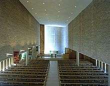 The International Style worship building was designed by the firm Saarinen and Saarinen, a father and son partnership of Eliel Saarinen (1873–1950) and Eero Saarinen (1910–1961), the project was Eliel Saarinen's last completed building. The sculptured stone panels were designed by William M. McVey (1922–1976). It was dedicated in 1949, and was acknowledged as an architectural masterpiece from the day it opened. As an early, outstanding example of modern religious architecture in the United States, it was widely published in the architectural, popular, and religious press, and provided inspiration for countless modern churches that were to be built in the 1950s and 1960s.[4] Noted conductor Osmo Vänskä said of the church that "It’s a good place to play. The acoustics are good for music — for chamber music — and it’s a good place for the audience to listen. It’s a place not only for the congregation but also a venue for concerts."[5]