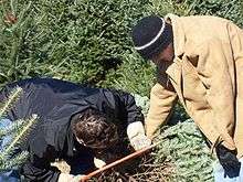 Christmas trees can be harvested and marketed in different ways. Some operations are known as "choose-and-cut" or pick-your-own farms, which allow customers to walk through the planted land, select their Christmas tree and cut down themselves.[8] Wholesale operations are more labor-intensive because they usually require the farmer to complete tasks such as baling, cutting, moving the trees to a roadside pick-up, and loading the harvest. In addition, this work must be completed during a very short period in November.[8] Growers also harvest trees by digging and balling the root and selling the trees as nursery stock or as live, reusable Christmas trees. This last option allows trees to be harvested earlier than the usual six- to ten-year period required to grow a mature Christmas tree.[8]