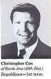 Cox was elected to Congress in 1988 from what was then California's 40th District. He was re-elected eight more times from this Orange County-based district, which was renumbered as the 47th District in 1993 and the 48th District in 2003.[1]