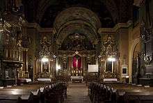 Inside the church there are late Baroque altars originating in 1745–1748. A crucifix stands atop the high altar in accordance with the basic rule of the Order. The Patron of the church, St. Casimir, has his facsimile painted at the side altar (first on the left). This image was most probably painted in 1660-1670 and is assumed to be the work of the Gdańsk painter Daniel Schultz. Paintings on the vault of the church date from 1904 and are the work of Aleksander Mroczkowski.[2]