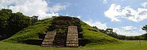 Cihuatán was a very large Mesoamerican city.[2] The city possessed two principal ceremonial centres, known respectively as the Eastern and Western Ceremonial Centres. In 1978 the Western Ceremonial Centre was cleared of vegetation and mapped. Excavations included a cluster of residential buildings that had been hastily abandoned due to fire, resulting in many of the household goods being preserved when the walls collapsed.[4] The ceremonial architecture of the site core is of a pan-Mesoamerican style; outside of the ceremonial groups, the style is distinctively Maya.[2]