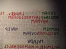 The Cippus Perusinus is a stone tablet discovered on the hill of San Marco, near Perugia, Italy, in 1822. The tablet bears 46 lines of incised Etruscan text. The cippus is assumed to be a text dedicating a legal contract between the Etruscan families of Velthina (from Perugia) and Afuna (from Chiusi), regarding the sharing or use of a property upon which there was a tomb belonging to the noble Velthinas.[1][2]Turkish researcher Kazım Mirşan has claimed that he deciphered the text according to the tamga system.