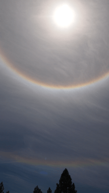 A circumhorizontal arc is an optical phenomenon that belongs to the family of ice halos formed by the refraction of sun- or moonlight in plate-shaped ice crystals suspended in the atmosphere, typically in cirrus or cirrostratus clouds. In its full form, the arc has the appearance of a large, brightly spectrum-coloured band running parallel to the horizon, located far below the Sun or Moon. The distance below the Sun or Moon is twice as far as the common 22-degree halo. Red is the uppermost colour. Often, when the halo-forming cloud is small or patchy, only fragments of the arc are seen. As with all halos, it can be caused by the Sun as well as (but much more rarely) by the Moon.[1]