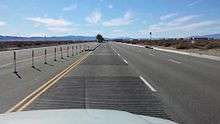 In October 2014, the village of Tijeras, New Mexico (just east of Albuquerque), gained national notoriety for a nearby "musical road", a two-lane stretch of U.S. Highway 66 (Route 66) with grooves in the roadway (rumble strips) arranged to cause the sounds of a famous song ("America the Beautiful") to be heard when vehicles drive on it at 45 mph. This highway is labelled NM 333, between Miles 4 and 5, eastbound.[13] Funded by the National Geographic Society, the project was coordinated with the New Mexico Department of Transportation who described the project as a way to get drivers to slow down.[14][15][16]