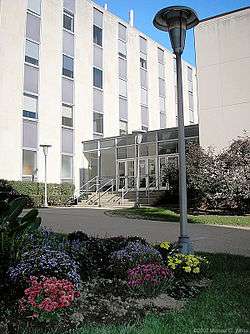Langley Hall's construction was begun in 1959 made possible by a $2.5 million grant ($20.3 million today) from the General State Authority.[4] Completed in 1961 in the International Style,[5] Langley Hall was originally the home of the Department of Geology, Department of Psychology, and the Department of Biology, (now part of the Department of Biological Sciences).. It was originally conceived as an annex to Clapp Hall, to which it is connected on the south side. For this reason, the room numbers in Langley Hall all begin with the letter 'A' to denote 'Annex.' The Department of Biological Sciences occupies the First, Second, Third, and Fifth floors of Langley Hall. Crawford Hall, home of the Department of Neuroscience, is connect to Langley Hall's north side, together forming the 3-building CLC complex that is devoted to the biological sciences, housing both biological sciences and neuroscience lectures and research laboratories. A research greenhouse composed of four bays is located on Langley Hall's sixth floor.[6]