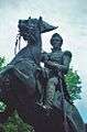 Mills also captured a tense and crucial moment in the Revolutionary War with the creation of an equestrian statue of Lieutenant General George Washington in 1860. Congress commissioned this statue in 1853 because of the tremendous popularity of Mills's equestrian statue of Andrew Jackson. The elaborate high pedestal that Mills originally designed, with three tiers of sculptured relief panels and smaller equestrian statues of Washington's generals, were never executed because of lack of funds.[7]