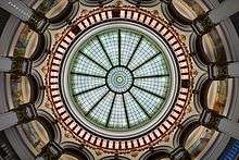 The Cleveland Trust Company asked Post to design an interior that was simple, a concept in line with the idea that a savings bank is about economy.[32] The interior is dominated by an 85-foot (26 m) high,[11] 61-foot (19 m) wide[6][34] concrete rotunda[13] which illuminates three of four lower floors.[54] The rotunda's dome has an unusual number of segments (13), due to the acute angle of the building site.[30] Embedded in the gold gilt[46] concrete frames of the dome are numerous panels of stained lead glass.[32] The double-paned glass panels depict an intricate, repetitive, green and yellow floral pattern.[3] A series of small lights, set in bronze rosettes, illuminated the dome from below at night.[40]