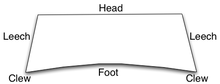 The foot of a sail is its bottom edge, which, on a mainsail, runs parallel to the boom.[1] The forward (leading) edge of the sail is called the luff, which, in a mainsail, is parallel to the mast.[1] The aft (back) edge of a sail is called the leech (also spelled leach), which is opposite the luff, and forms the hypotenuse of the triangle[1]
