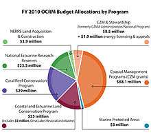 The Office of Ocean and Coastal Resource Management (OCRM) awards four types of funding to the National CZMP. Combined, the 2011 award totaled over $65 million which supports a "variety of coastal management projects." [7]