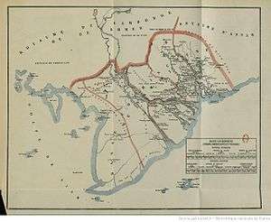 The victory at Ky Hoa allowed the French and Spanish to move to the offensive. In April 1861, Mỹ Tho fell to the French. An assault force under the command of capitaine de vaisseau Le Couriault du Quilio, supported by a small flotilla of gunboats, advanced on Mỹ Tho from the north along the Bao Dinh Ha creek, and between 1 and 11 April destroyed several Vietnamese forts and fought its way along the creek to the environs of Mỹ Tho. Le Couriault de Quilio gave orders for an assault on the town on 12 April, but in the event the assault was not necessary. A flotilla of warships under the command of Admiral Page, who had been sent by Charner to sail up the Mekong River to attack Mỹ Tho by sea, appeared off the town on the same day. Mỹ Tho was occupied by the French on 12 April 1861 without a shot being fired.[9] In March 1861, shortly before the capture of Mỹ Tho, the French again offered terms to Tự Đức. This time the terms were considerably harsher than those offered by Page in November 1859. The French demanded the free exercise of Christianity in Vietnam, the cession of Saigon province, an indemnity of 4 million piastres, freedom of commerce and movement inside Vietnam and the establishment of French consulates. Tự Đức was only prepared to concede on the free exercise of religion, and rejected the other French terms. The war went on, and after the fall of Mỹ Tho the French raised their territorial claims to include Mỹ Tho province as well as Saigon province.[10] Unable to confront the French and Spanish forces in battle, Tự Đức resorted to guerilla warfare, sending his agents into the conquered Vietnamese provinces to organise resistance to the invaders. Charner responded on 19 May by declaring Saigon and Mỹ Tho provinces to be in a state of siege. French columns roved through the Cochinchinese countryside, fanning popular resistance by the brutality with which they treated suspected insurgents. Charner had ordered them not to offer violence to peaceful villagers, but these orders were not always obeyed. The Vietnamese guerillas on occasion posed a serious threat to the French. On 22 June 1861 the French post at Gò Công was attacked, unsuccessfully, by 600 Vietnamese insurgents.[11]