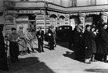 The Einsatzkommando influenced[38] mobs of former members of Pērkonkrusts and other extreme right-wing groups began mass arrests, pillaging and murders of Jews in Riga, which led to death of between 300 and 400 Jews. Killings continued under the supervision of SS Brigadeführer Walter Stahlecker and ended when more 2,700 Jews had been murdered.[34][37] The activities of the Einsatzkommando were constrained after the full establishment of the German occupation authority, after which the SS made use of select units of native recruits.[35] German General Wilhelm Ullersperger and Voldemar Weiss, a well known Latvian nationalist, appealed to the population via a radio address to attack "internal enemies". During the next few months, activities of the Latvian Auxiliary Security Police was primarily focused on killing Jews, Communists and Red Army stragglers in Latvia as well as in neighboring Belorussia.[36] The group alone murdered almost half of Latvia's Jewish population,[39] about 26,000 Jews, mainly in November and December 1941.[40]