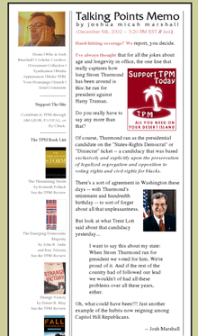 On 6 December 2002, Josh Marshall's talkingpointsmemo.com blog called attention to U.S. Senator Lott's comments regarding Senator Thurmond. Senator Lott was eventually to resign his Senate leadership position over the matter.